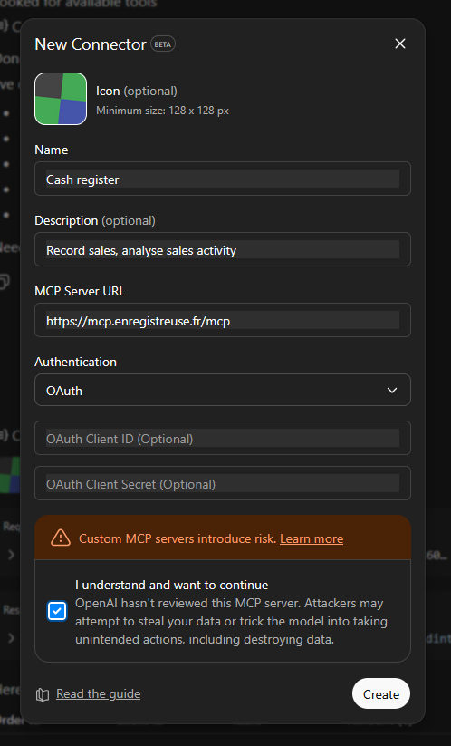 Dans ChatGPT, en utilisant un Espace de travail, accédez aux paramètres, Connecteurs, puis ajoutez un nouveau connecteur avec les paramètres suivants